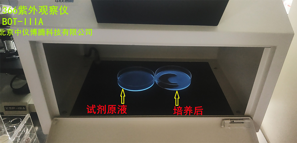大腸埃希氏菌測定熒光觀察使用方法:將臺式紫外光燈置于暗處,插上電源,將經過24小時培養后的EC-MUG管在燈下照射,如有藍色熒光產生則為大腸埃希氏菌陽性管;